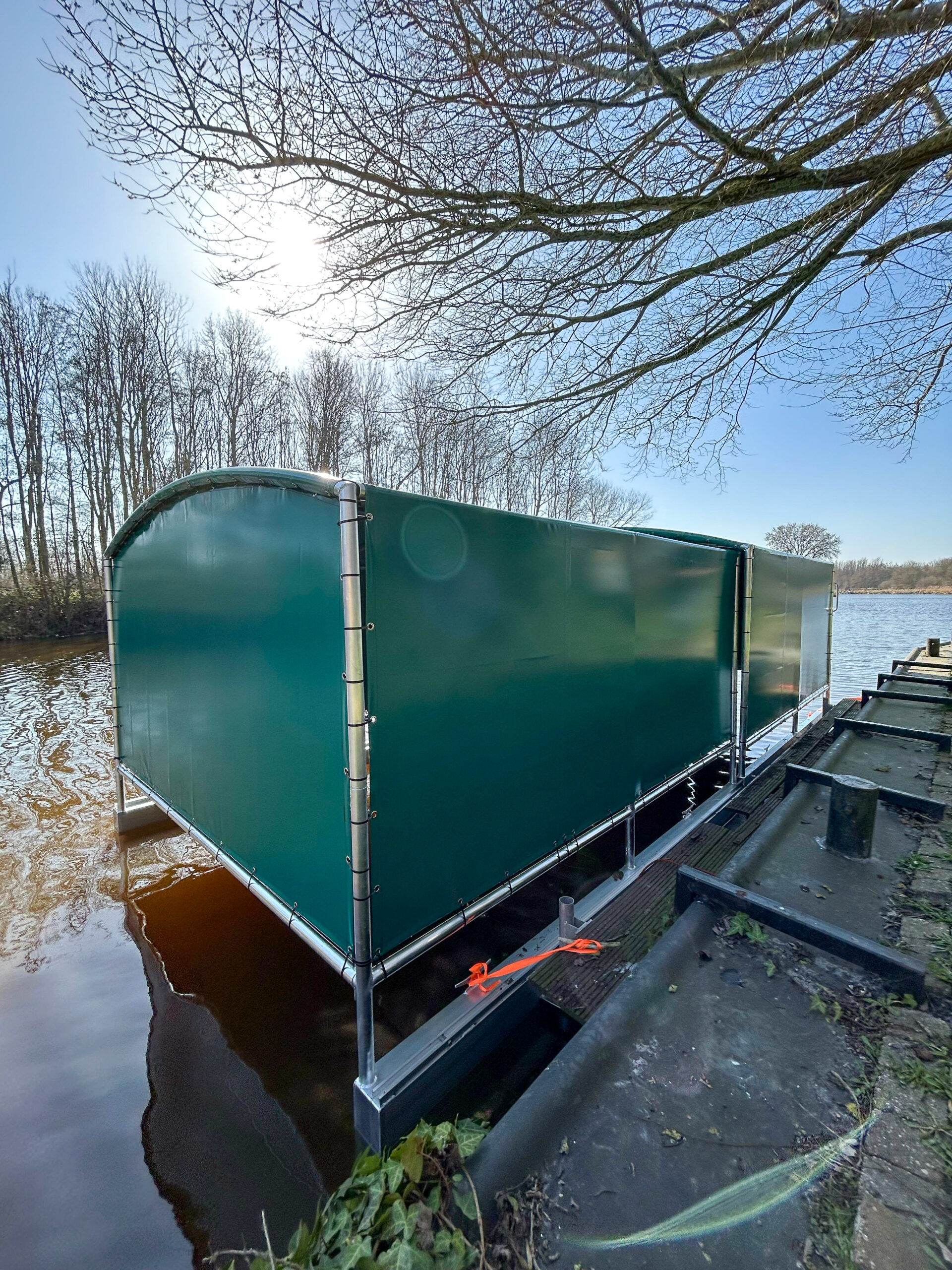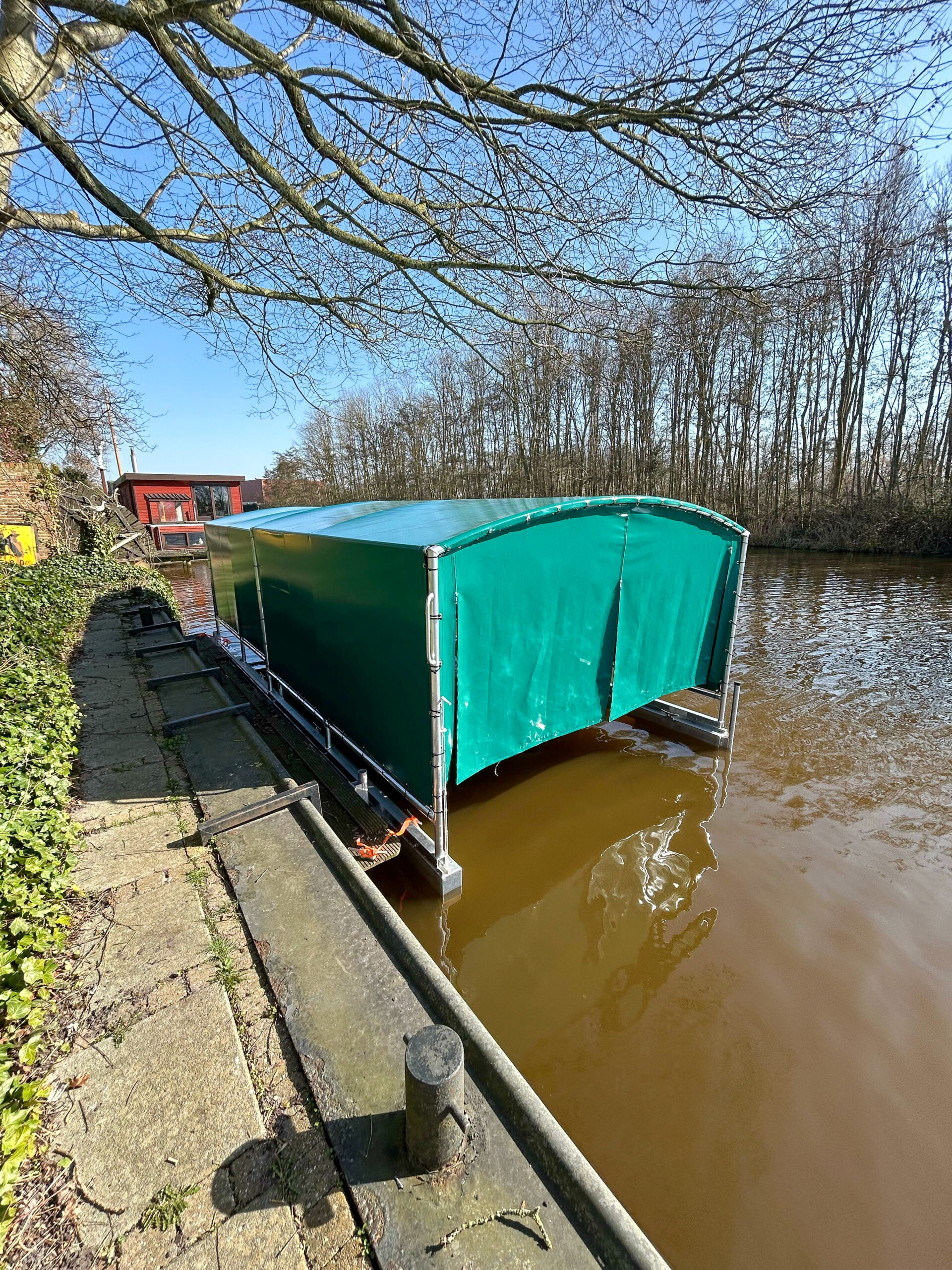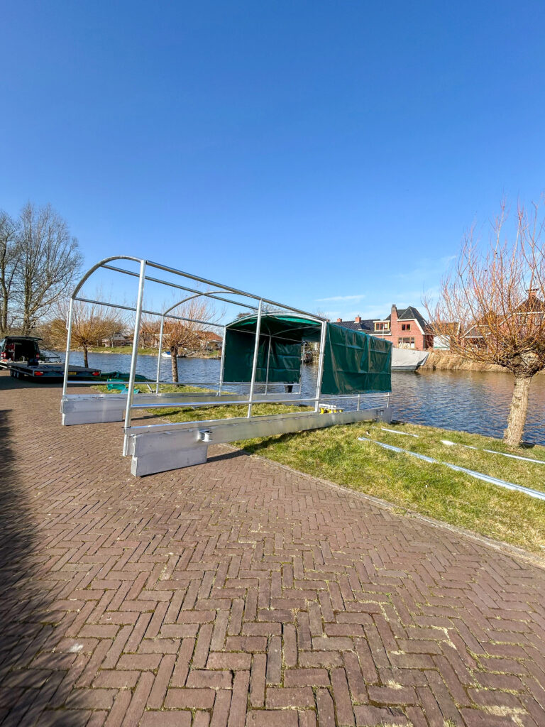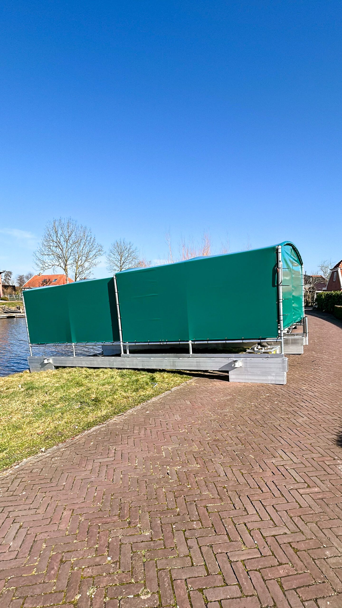 In Termunterzijl haben wir ein Floating-Floating-System mit Überdachung installiert. Dieses maßgefertigte Vordach mit den Abmessungen 7 Meter Länge, 3 Meter Breite und 2,1 Meter Höhe liegt derzeit an einem provisorischen Liegeplatz. Vor der endgültigen Montage muss das Gerüst noch angepasst werden.