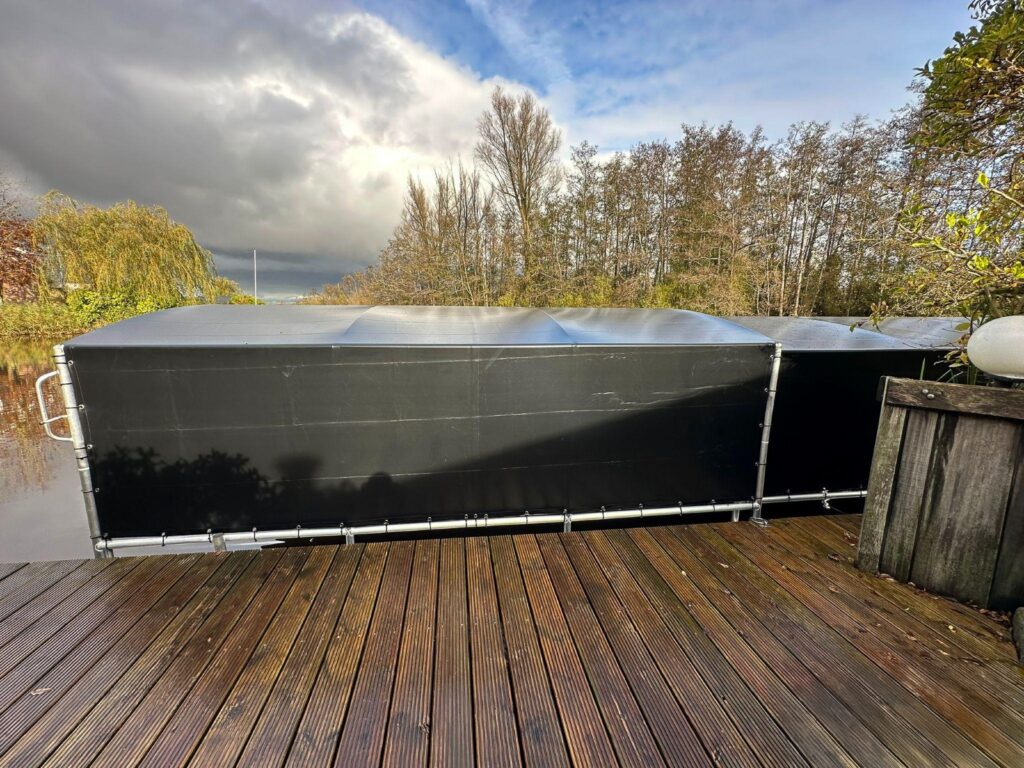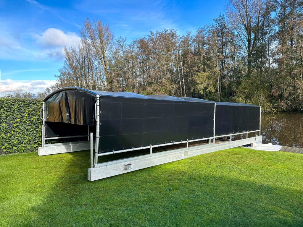 Für unseren Kunden in Zwartsluis haben wir eine maßgeschneiderte Drijf-Drijf-Bootsabdeckung installiert. Dieses 9 Meter lange, 3,20 Meter breite und 1,75 Meter hohe Vordach bietet nicht nur optimalen Schutz, sondern passt sich auch flexibel dem Wasserstand an, sodass das Boot immer stabil steht. Dank der robusten Konstruktion können unsere zufriedenen Kunden jetzt schnell und mühelos ein- und ausfahren.
