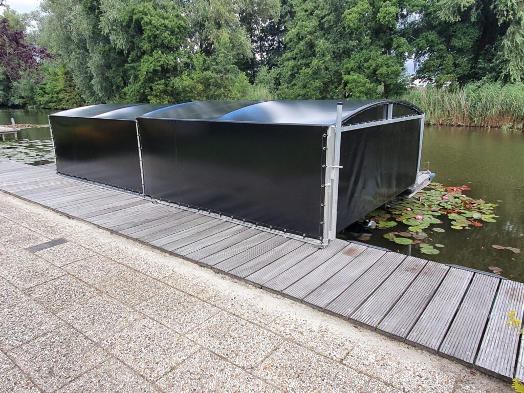 The boat shelter with Shore-Shore system is particularly suitable if you have a dock on both sides. This is because this floating boathouse is installed along two shorelines. Thanks to the unique stainless steel roller system on both sides, this floating boathouse is easy to operate.