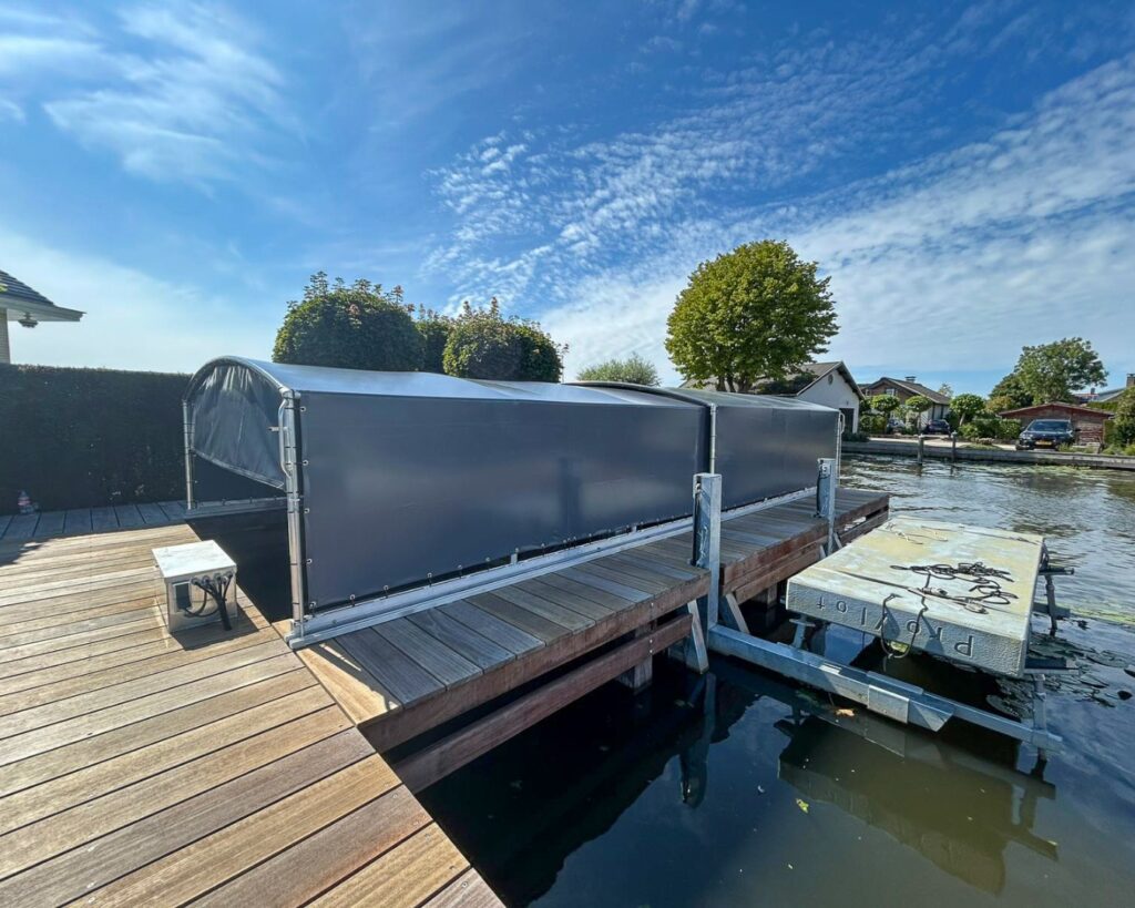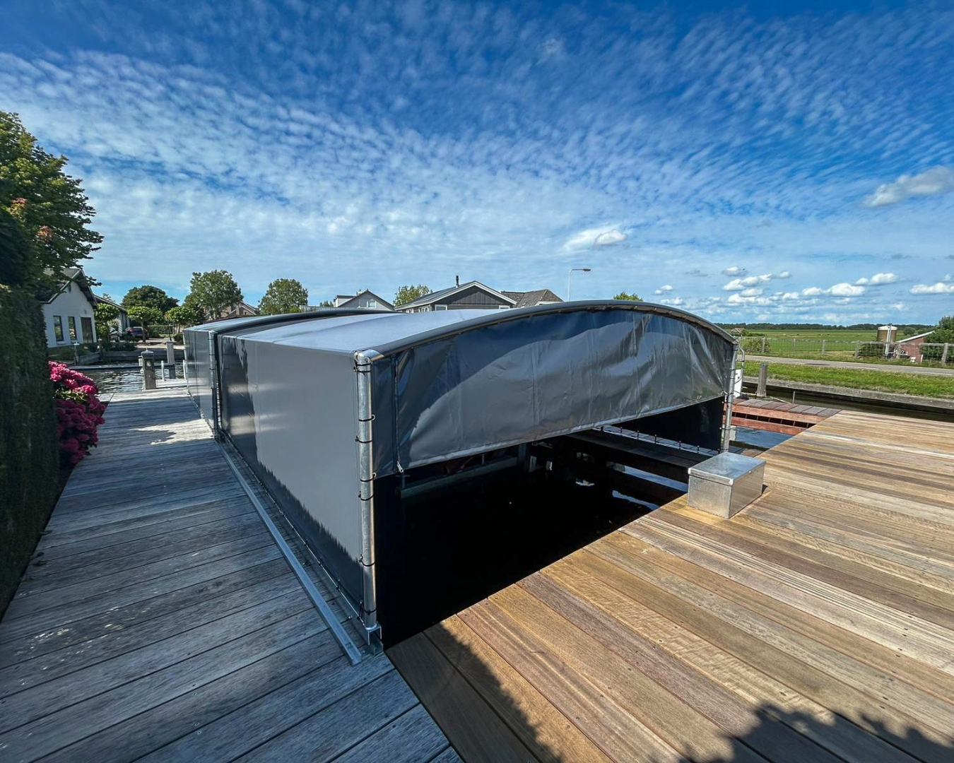 In Woubrugge, we installed a real eye-catcher: a boat shelter measuring 8500 x 3750 x 2000 mm, equipped with the smart shore-to-shore system.