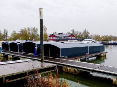 Nuestra cubierta flotante de embarcación con sistema flotar – flotar ofrece una solución única para proteger su embarcación. Esta cubierta flotante se encuentra completamente sobre el agua, lo que le permite ubicarla en diversos lugares sin restricciones. Con una capacidad de carga de hasta 8000 kg, esta cubierta es adecuada para embarcaciones más pesadas y ofrece una excelente protección contra las inclemencias del tiempo, el desgaste y el crecimiento de algas.
