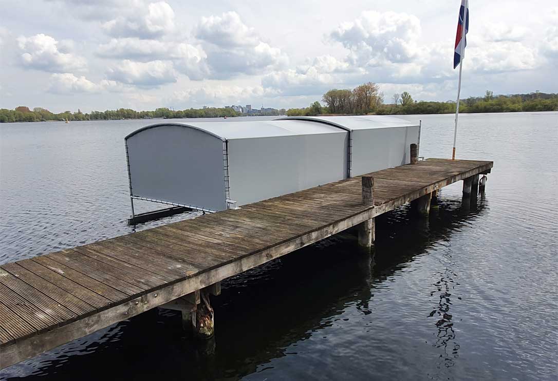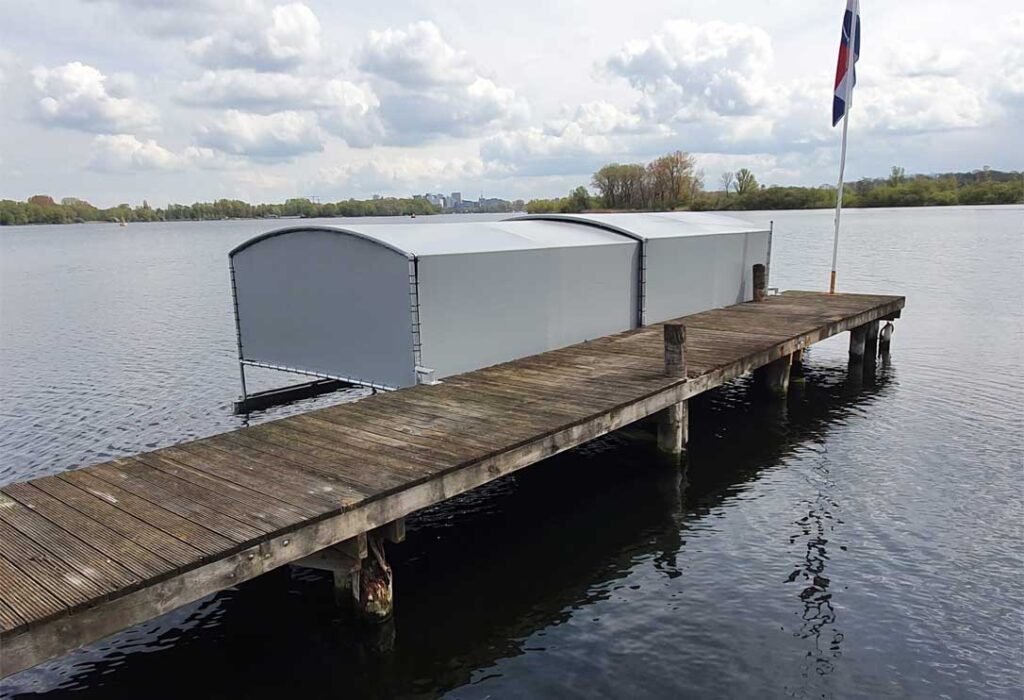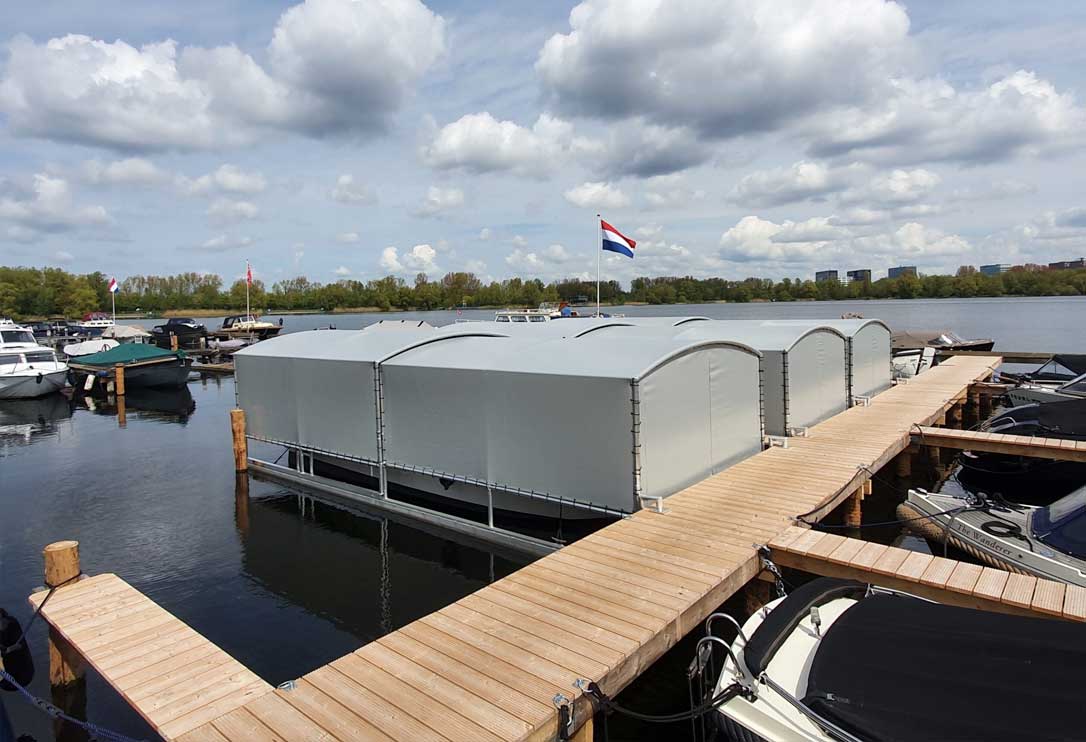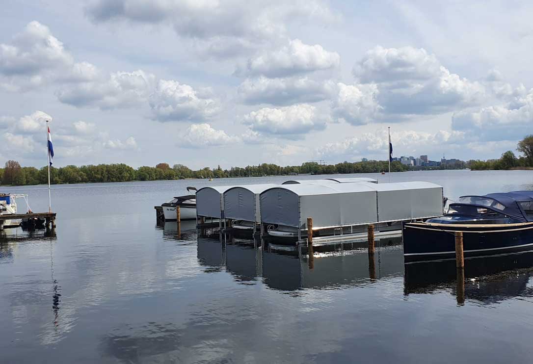 Onze drijvende bootoverkapping met Drijf-Drijf systeem ligt volledig op het water. Met als voordeel dat dit systeem niet afhankelijk is van een walkant. De drijvers van dit systeem zorgen voor stabiliteit. Ook dit systeem veert mee met hoog en laag water, ideaal in vele opzichten.