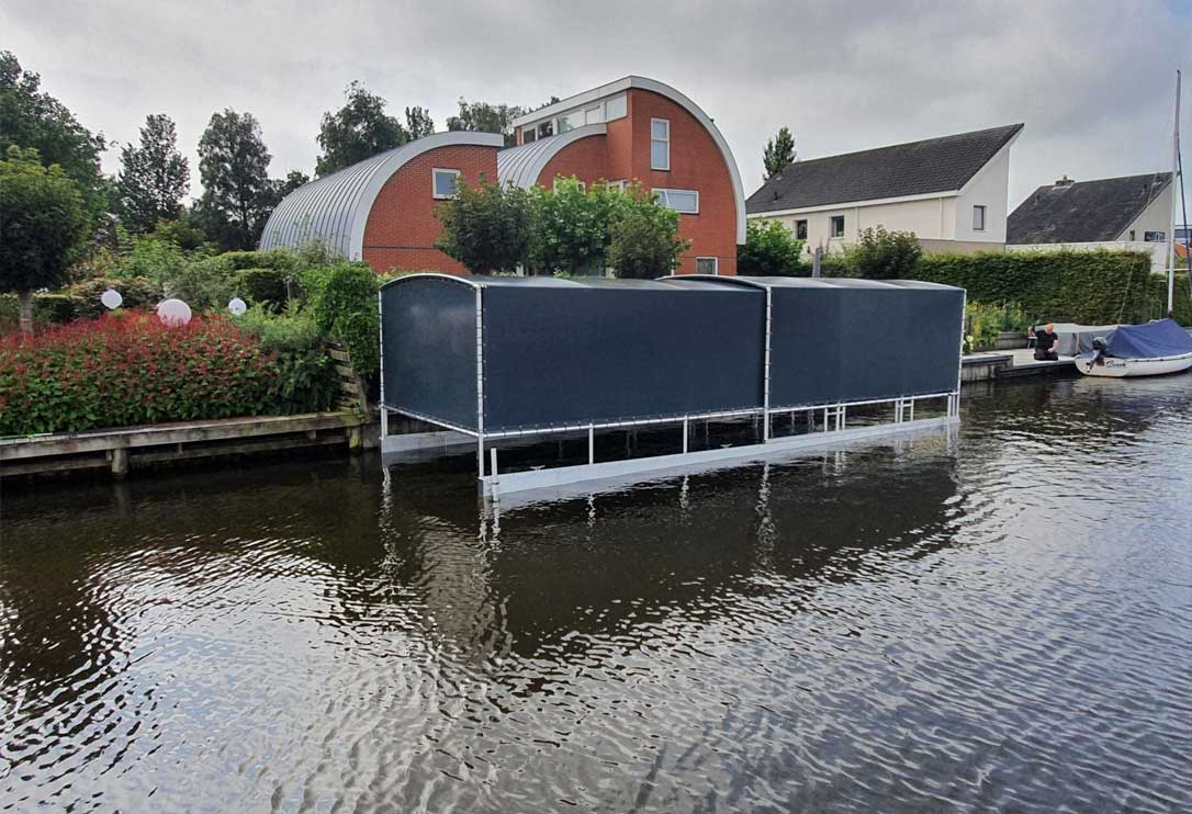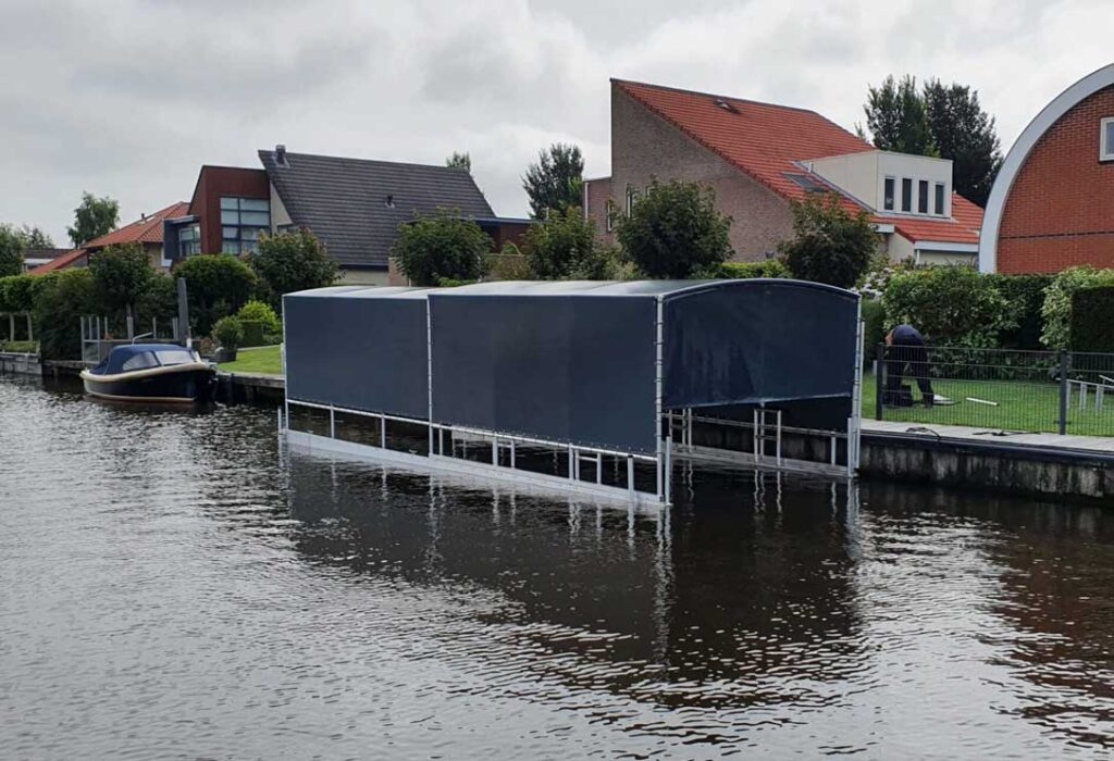Onze drijvende bootoverkapping met Drijf-Drijf systeem ligt volledig op het water. Met als voordeel dat dit systeem niet afhankelijk is van een walkant. De drijvers van dit systeem zorgen voor stabiliteit. Ook dit systeem veert mee met hoog en laag water, ideaal in vele opzichten.